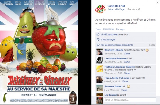 Aline Bonnet & Amélie Louvet : Il y a une vraie genèse à notre présence sur Facebook. Quand Facebook s’est démocratisé en France en 2009/2010, beaucoup de fans pages Oasis (aussi bien sur les produits que sur les fruits) ont été créées par les Français. Nous avons eu la possibilité de les regrouper et donc d’animer une page de 700 000 fans. Ce sont les internautes qui ont été à l’origine de notre success story.