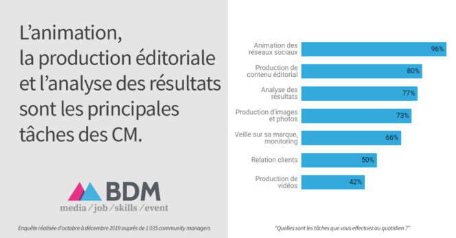 Enquête réalisée par BDM, du 17 octobre au 17 décembre 2019 auprès de 1 035 community managers et social media managers, en partenariat avec IFOCOP et IFOCOP Expériences, qui proposent deux formations pour devenir community manager. Une formation en présentiel, centrée sur le développement de compétences opérationnelles ; et une formation en ligne qui s’articule autour de 10 modules, pour acquérir les fondamentaux du marketing, de l’écriture pour le web, de la mesure d’audience…