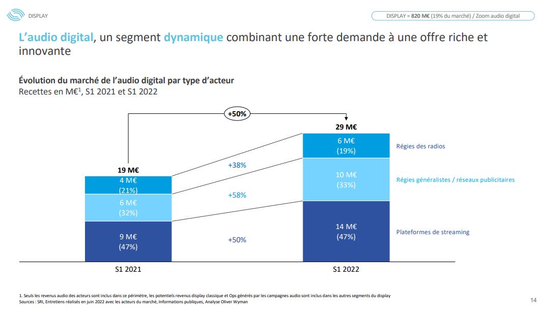 Si le format vidéo est toujours largement porté par l’instream, l’outstream observe une belle progression : +49 % pour atteindre 40 millions d’euros au 1er semetre 2022. Le format audio, lui, est porté notamment par les plateformes de streaming en hausse de +50 %, représentant 14 millions d’euros.