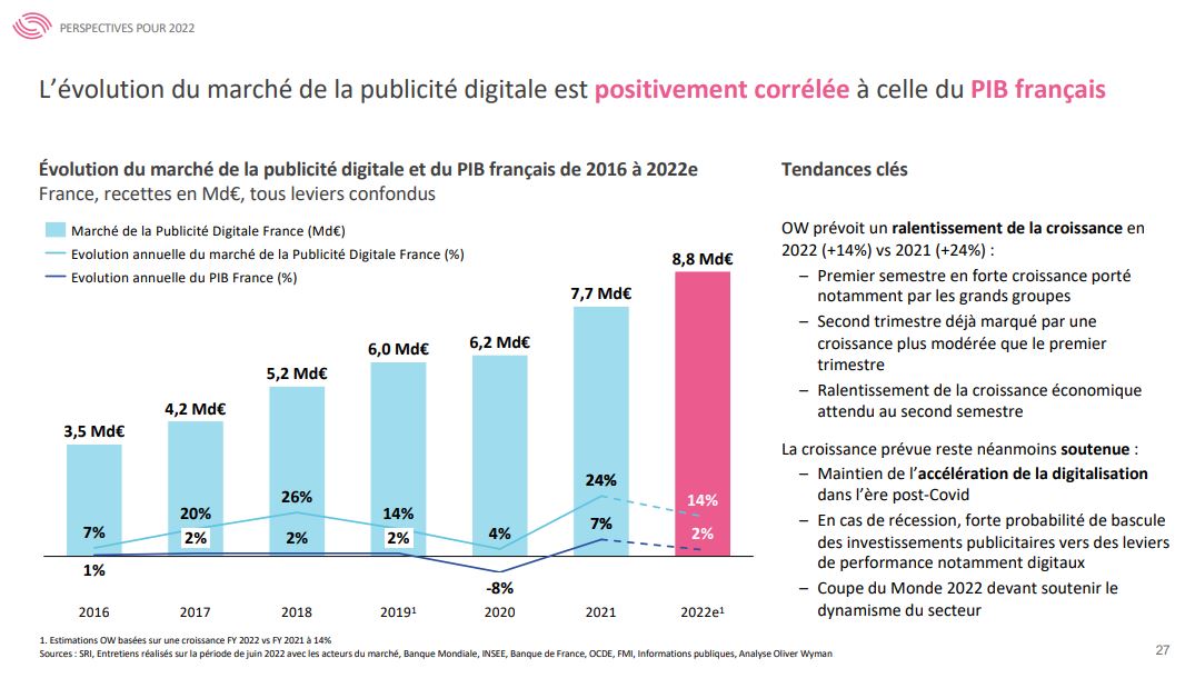 Comme pour chaque nouvelle édition de l’Observatoire de l’e-pub, le cabinet Oliver Wyman établit des prédictions concernant le marché de la publicité digitale en France. Ainsi, il prévoit une croissance plus modérée, aux alentours de 14 %, soit environ 8,8 milliards d’euros pour le 2e semestre 2022. La raison principale de cette estimation est liée au contexte économique et à la menace de récession mondiale.