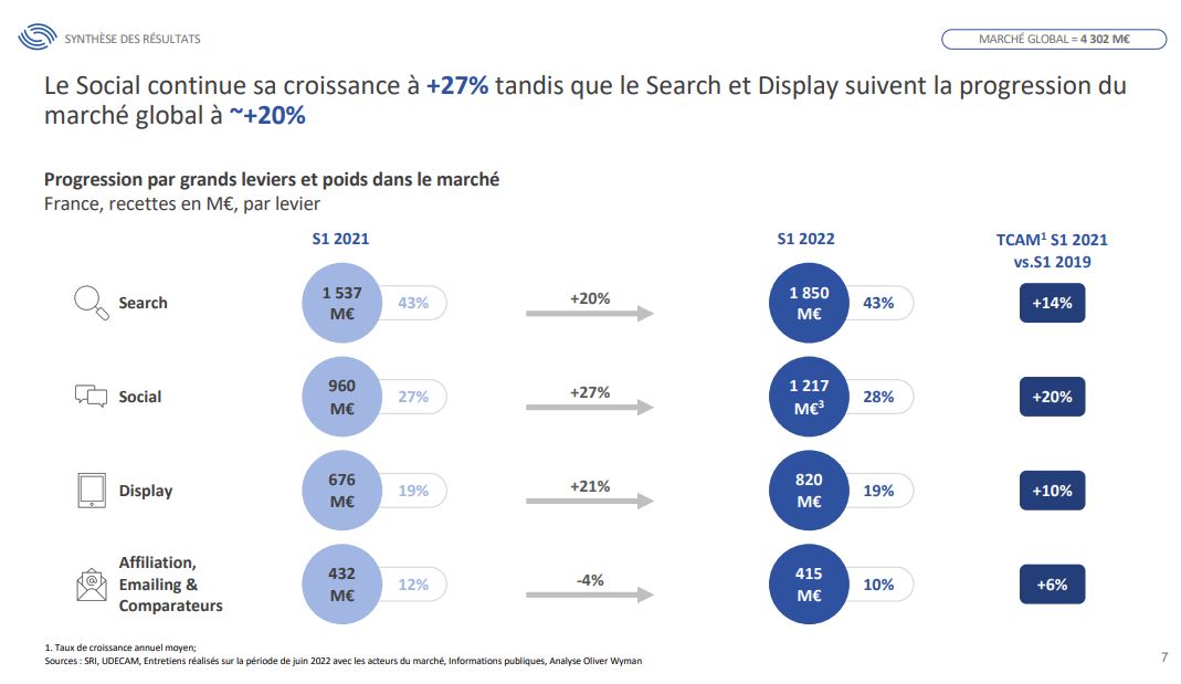 Le search enregistre une croissance de 20 % et le social une très forte progression de 27 % au 1er semestre 2022.