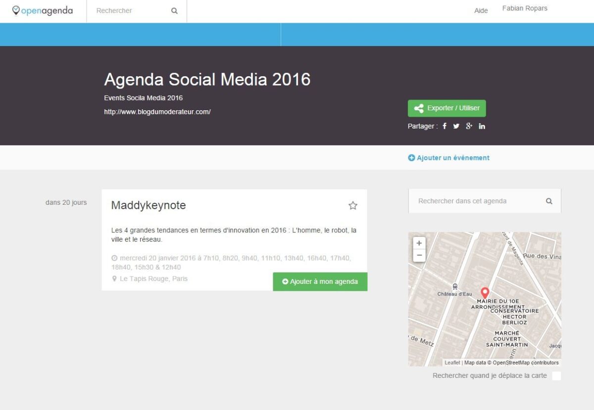 2016 arrive à grands pas, et cette année encore il va falloir réussir à s’organiser. Les agendas sont indispensables pour regrouper les événements de l’année. Le service Open Agenda propose une solution complète, gratuite et libre pour créer des agendas simplement. Ceux-ci sont par ailleurs intégrables à votre site ou blog et une API permet de le synchroniser avec Outlook ou WeMap. Pour utiliser Open Agenda, vous devrez tout d’abord créer un agenda, ici un agenda des différents événements Social Media à venir. Il suffit d’une description et de quelques éléments pour le créer. Une fois cette étape réalisée, vous devrez ajouter les événements à venir. Là encore tout est très simple et très bien pensé. Il suffit d’ajouter l’adresse, le nom, la description et tout est automatiquement ajouté à votre agenda. Une fois votre agenda terminé, vous pouvez l’exporter en format Google Calendar, en iCal, en RSS, en ICS, en CSV, en xlsx, en PDF en XML et en JSON. Autant dire que vous pouvez réutiliser cet agenda sur à peu près tous vos supports. Open Agenda est un excellent outil qui peut vous permettre de créer des agendas intégrables à votre site sans connaissances techniques et à peu de frais. L’interface est particulièrement intuitive et Open Agenda est totalement pensé pour le partage. Une excellente ressource qui peut se montrer vraiment utile.