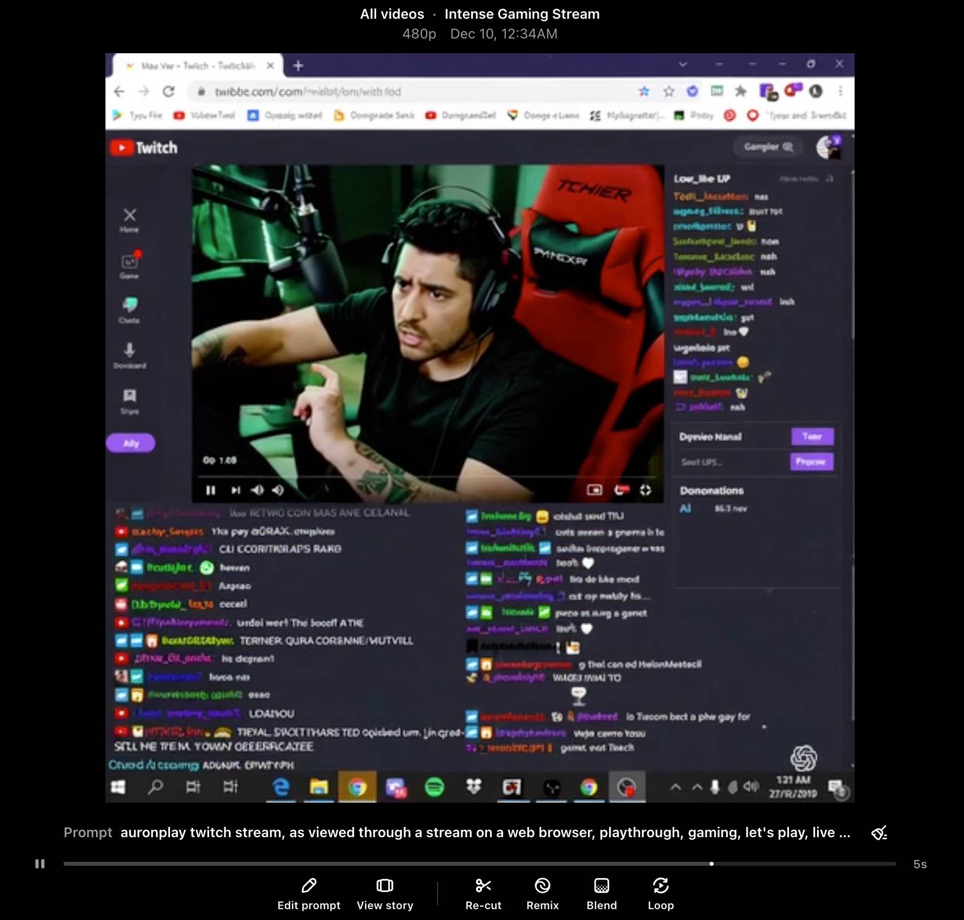 Exemples à l’appui, Kyle Wiggers démontre en effet la capacité de l’outil d’OpenAI de produire d’étonnantes séquences ressemblant à s’y méprendre à de célèbres jeux. Mais ce n’est pas tout, il note également que « Sora semble avoir une idée de ce à quoi devrait ressembler un stream Twitch ». Dans l’exemple ci-dessous, on reconnaît sans problème l’interface, même si celle-ci n’est pas parfaite, ainsi qu’un étrange mélange des logos Twitch et YouTube, donnant à penser au journaliste de TechCrunch que de nombreux streams Twitch ou walkthrough de jeux vidéo sur YouTube ont été utilisés pour l’entraînement de Sora. L’IA semble même pouvoir générer des créateurs et créatrices de contenu connus, comme AuronPlay ou Pokimane.