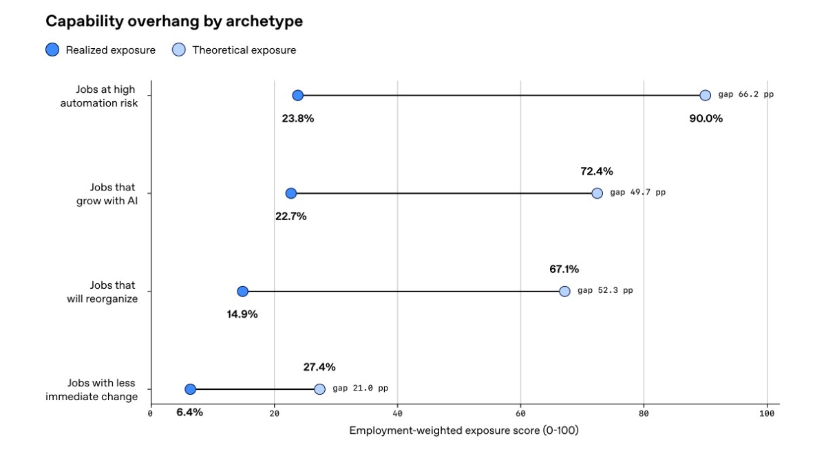 Le résultat met en évidence un décalage systématique : dans tous les secteurs, l’usage effectif reste nettement inférieur au potentiel technique. OpenAI désigne ce phénomène sous le terme de capability overhang. Dans les métiers les plus exposés à l’automatisation, le taux d’usage réel atteint 23,8 %, pour un potentiel estimé à 90 %, soit un écart de 66 points. Ce différentiel illustre le fossé persistant entre les capacités de l’IA et leur adoption concrète.