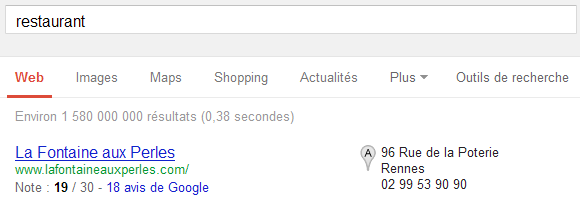 - Le site web : les personnes qui s’intéressent à votre établissement pourront facilement trouver votre site Internet. À noter que celui n’apparaîtra pas uniquement au sein de votre page locale Google+ : il sera également visible directement dans les résultats de recherche, tout comme le numéro de téléphone, l’adresse, et la note moyenne attribuée par les internautes. Vous pouvez associer votre site web à votre page pour améliorer sa visibilité.