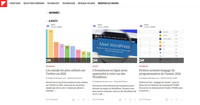 Pour suivre avec assiduité et efficacité toutes les actualités sur le web, nous vous conseillons Flipboard, un outil similaire à l’outil de veille Feedly. Lors de votre création de compte, vous choisissez les thématiques qui vous intéressent et Flipboard affiche des contenus provenant des médias et blogs qui correspondent à vos intérêts. Ainsi, chaque jour, en un coup d’œil, vous pouvez découvrir de nouveaux contenus et vous tenir au courant de vos sujets de prédilection !