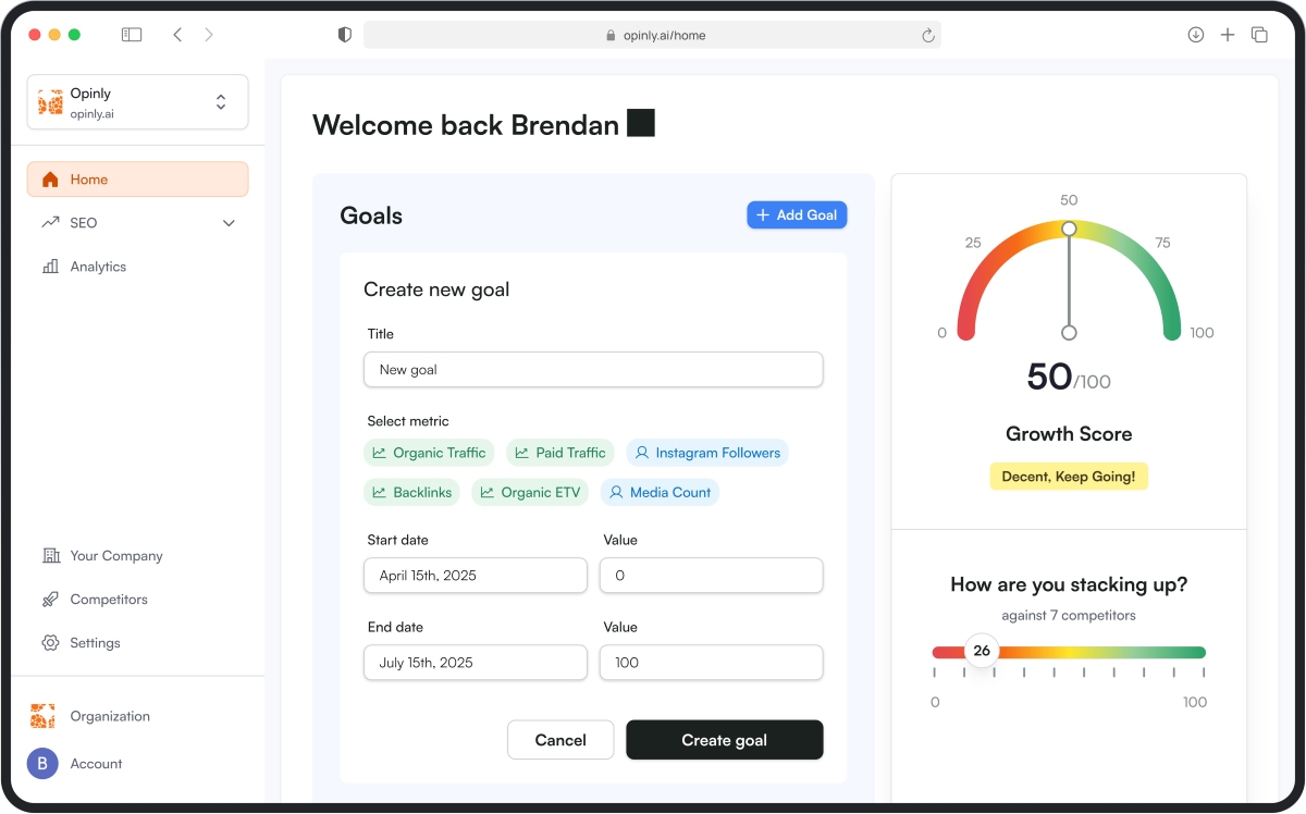 Opinly est une plateforme d’intelligence artificielle spécialisée dans l’analyse concurrentielle. Son objectif est de permettre aux entreprises de suivre en temps réel les stratégies de leurs concurrents, du SEO aux campagnes marketing, en passant par les réseaux sociaux.