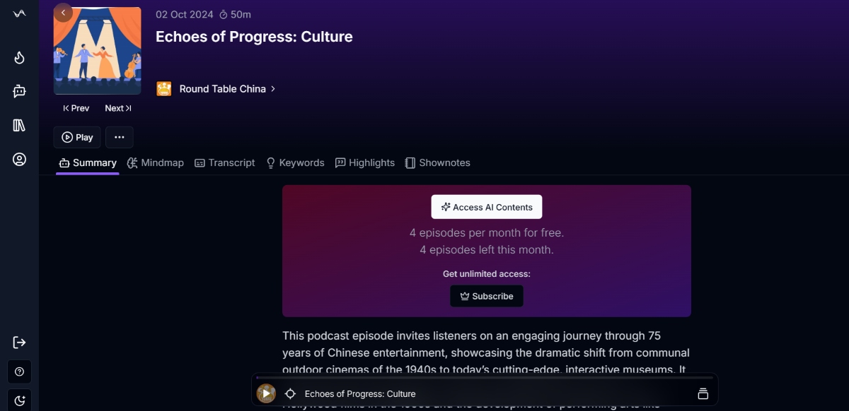 Un plan gratuit permet d’analyser jusqu’à quatre épisodes par mois. Il est également possible d’importer des podcasts non présents sur la plateforme, ainsi que des vidéos YouTube. Celles-ci peuvent être visionnées directement dans l’application tout en consultant les cartes, résumés ou citations générés par l’intelligence artificielle.