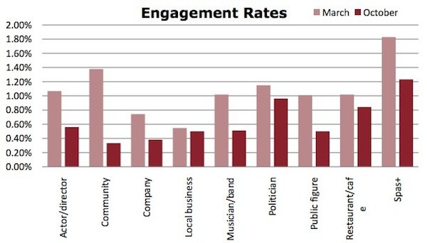 Le reste de l’étude présente des chiffres sur l’engagement de ces pages, toujours par catégorie. Ces résultats se basent sur des critères tels que les likes, commentaires et partages. Difficile d’interpréter ces chiffres cela dit, tant ils dépendent de la stratégie adoptée par l’entreprise. Attendons de voir le résultat de ce genre d’études d’ici quelques mois afin de voir si les nouvelles pratiques ont provoqué une amélioration de ces chiffres. On pense notamment au call-to-action, qui commence à prouver son efficacité. Mais là se pose la limite entre un engagement naturel et artificiel.
