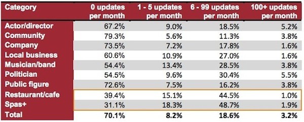 Les pages les plus actives sont sans grande surprise les artistes et groupes musicaux mais aussi les commerces locaux. Dans cette catégorie, nous incluons aussi les restaurants, cafés et tous les centres de beauté et spas.