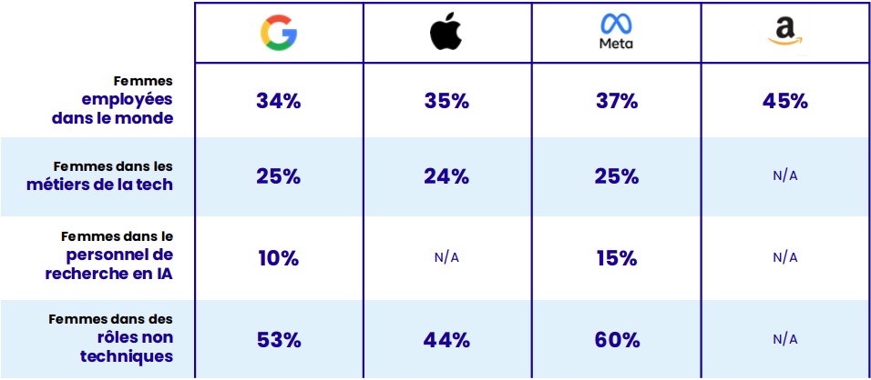 In fine, les femmes ne représentent, en Europe, que 35,8 % des diplômés en STEM et 26,3 % des effectifs travaillant dans l’IA. Une situation qui n’est guère meilleure chez les géants américains, où les femmes semblent cantonnées à des rôles non techniques dans le domaine de l’intelligence artificielle.