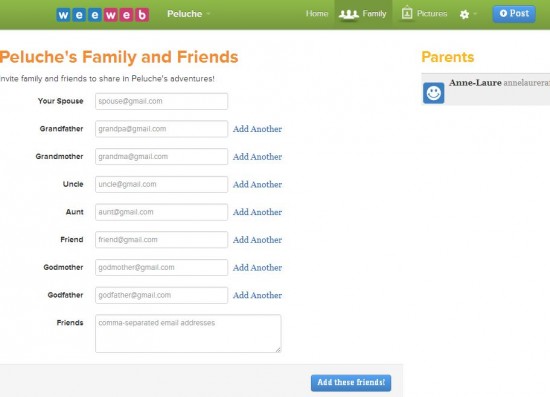 Résolument orienté vers les familles, Wee Web est un genre de mini-réseau social gratuit. Il est davantage destiné aux personnes souhaitant partager les photos de leurs enfants, de leur vie quotidienne, avec d’autres membres de leur famille ou des amis éloignés géographiquement. C’est une bien meilleure solution que Facebook pour poster des photos de son dernier né : tout y est très privé, pas de risque de commencer à donner une identité numérique à votre enfant contre son gré ! Pour commencer, il faut d’ailleurs indiquer le nom d’un de vos enfants (on peut feinter), puis on vous proposera d’inscrire également les autres membres de votre famille. Ils pourront ainsi suivre les diverses photos que vous mettrez en ligne, ainsi que des vidéos ou des commentaires. Détourné un peu de son usage d’origine (les photos de famille), on peut très bien se servir de Wee Web pour partager les photos d’un événement en particulier, de façon bien plus privative que Facebook.
