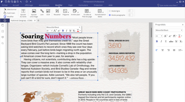 Vous avez toujours rêvé de modifier un PDF ? Avec PDFelement 6 c’est possible. Le logiciel permet d’éditer ses documents aussi simplement qu’un fichier Word. Avec l’OCR, même les documents scannés sont modifiables. PDFelement 6 permet de modifier les polices, leur taille ou style.