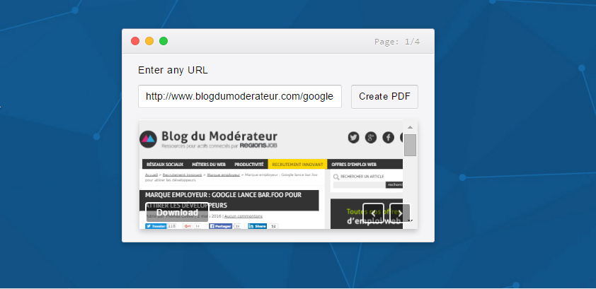 Le principe de Pdflayer dans sa version gratuite et hébergée sur la page d’accueil est simple : vous entrez l’URL de la page web qui vous intéresse, et vous cliquez sur « Create PDF ». En quelques secondes un fichier PDF est alors automatiquement généré et téléchargé. Mais ce n’est que la partie superficielle de Pdflayer qui est un outil puissant à destination des usages les plus poussés.