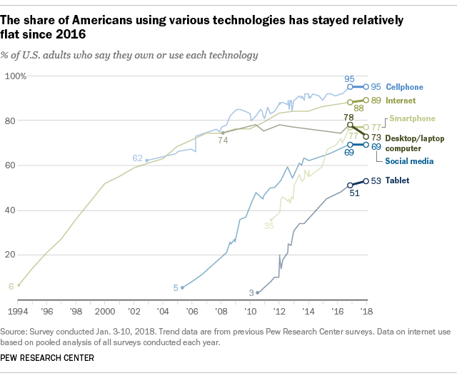 Après des années de croissance, les usages des technologies digitales et plus particulièrement du triptyque Internet, mobile et social media n’augmentent plus. Du moins aux USA. D’après une étude Pew Research Center, le nombre d’américains connectés et utilisateurs de mobile et de réseaux sociaux n’évolue plus.