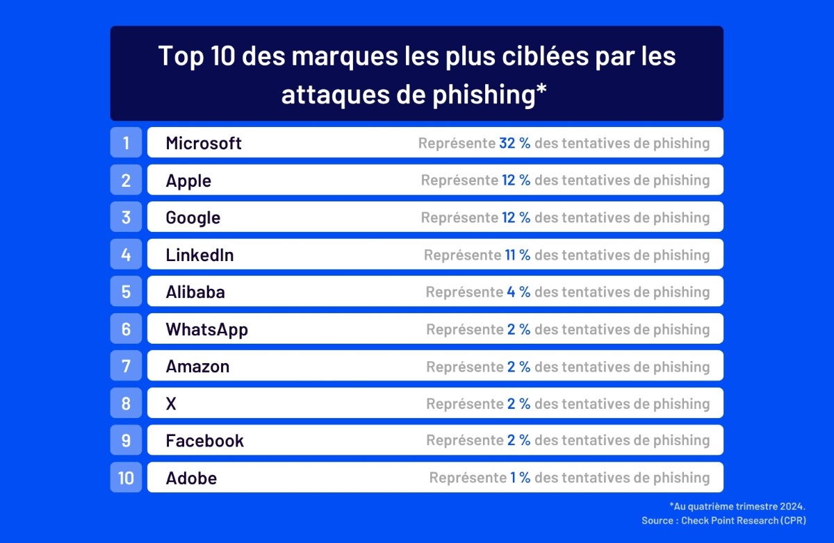 Voici le top 10 des marques les les plus ciblées par les attaques de phishing dans le monde, au quatrième trimestre 2024 (voir image de une) :