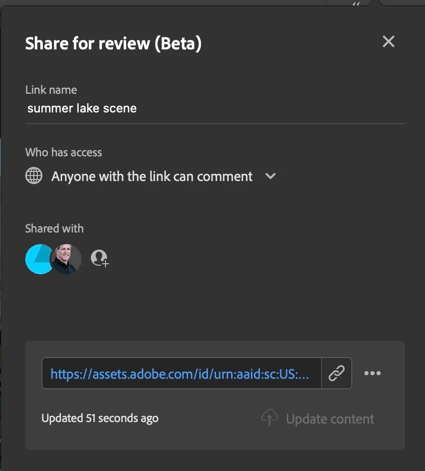 Photoshop lance également l’option Share for review (partage pour révision en français), qui permet de collaborer plus facilement sur un fichier Photoshop. Vous pouvez envoyer un lien à vos collaborateurs, qui peuvent alors laisser des commentaires en temps réel. Lorsque vous effectuez des modifications, les personnes qui disposent du lien voient les ajustements en temps réel. À noter que les utilisateurs peuvent accéder au projet et laisser des commentaires depuis n’importe quel navigateur web, sans avoir besoin de s’inscrire ou de se connecter.