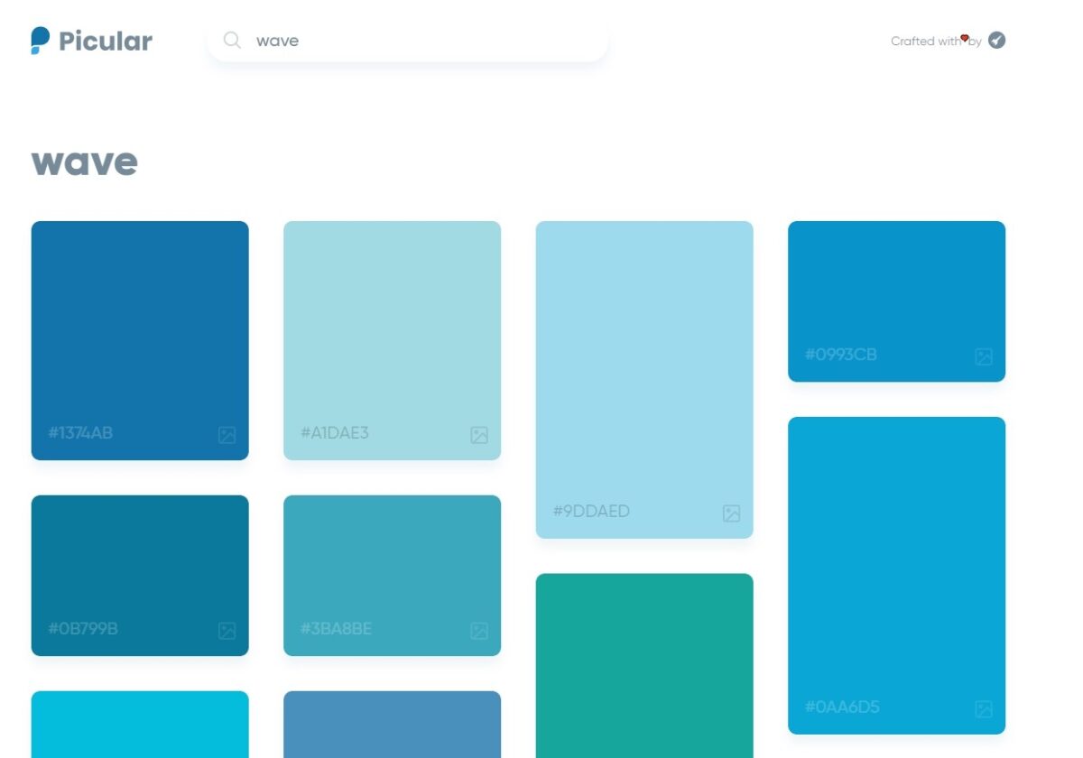 Nous venons de découvrir un outil qui va très vite avoir une place de choix dans nos favoris : Picular. Ce dernier est en fait un « Google des couleurs ». Il vous suffit d’entrer n’importe quel mot (en anglais) et le moteur de recherche vous trouve des couleurs en relation avec ce mot. C’est assez génial, et très vite indispensable. Voici par exemple une partie des résultats pour le mot « Wave ».