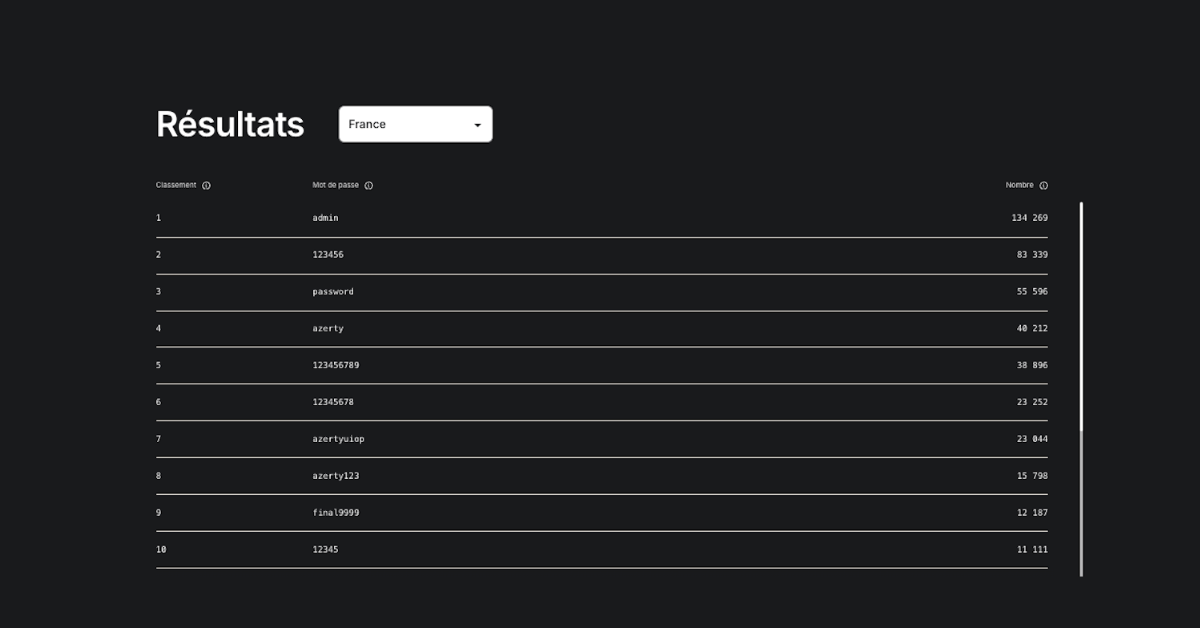 Pour la septième année d’affilée, NordPass relève « que les internautes continuent de privilégier des mots de passe faibles ». Un constat difficile à contester. En France, les combinaisons les plus plébiscitées restent d’une simplicité déconcertante : « admin » vire en tête, devant « 123456 », « password » et « azerty ». À noter que « 123456 », qui a « encore une fois décroché le titre controversé de mot de passe le plus utilisé au monde », déplore NordPass, n’est que sur la seconde marche du podium en France. Cocorico.