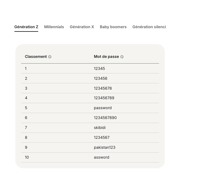 Pour preuve : « 12345 » et « 123456 » sont les mots de passe les plus utilisés par l’ensemble des générations, des Millenials aux Baby-boomers en passant par la Génération Z. « D’autres séquences numériques simples figurant dans la liste mondiale, telles que « 1234567 » ou « 1234567890 », occupent également les premières places », complète l’entreprise.