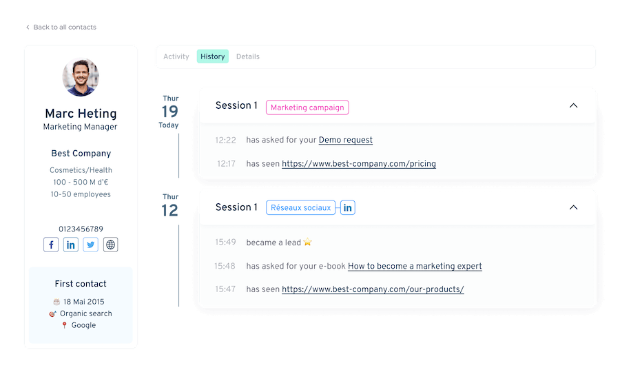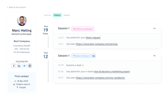 Ensuite, vous tirez profit de l’analyse comportementale, elle vous permet de comprendre vos prospects et de mieux les cerner. Vous avez accès à l’historique de ses dernières sessions effectuées sur votre site web ainsi que ses actions significatives telles qu’une demande de démo ou un téléchargement d’e-book.