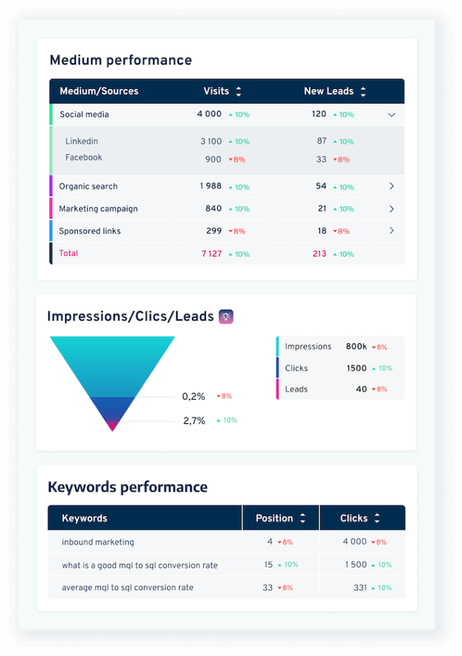 Ce tableau de bord à votre disposition vous donne l’opportunité de comprendre comment vous évoluez semaine après semaine, avec des chiffres à l’appui : trafic selon la source (social media, recherche organique, campagnes publicitaires, liens sponsorisés…), nombre de prospects acquis, nombre de clics, mots clés les plus performants et positions SEO… L’interface est très intuitive et vous permet de comprendre en un coup d’œil vos données marketing.
