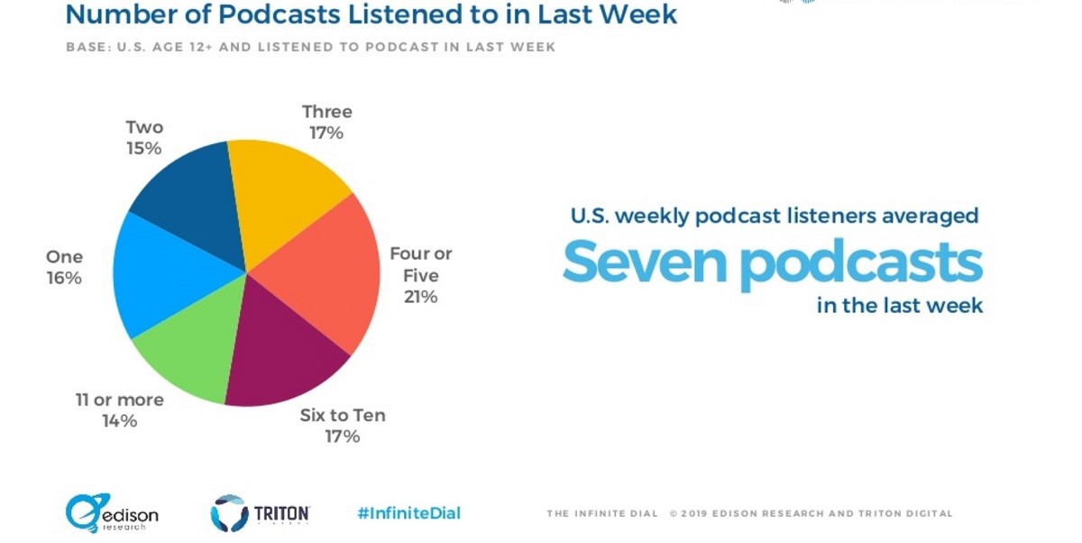 - Le nombre moyen de podcasts écoutés par semaine est resté stable à 7, malgré une hausse du nombre de consommateurs de podcasts.