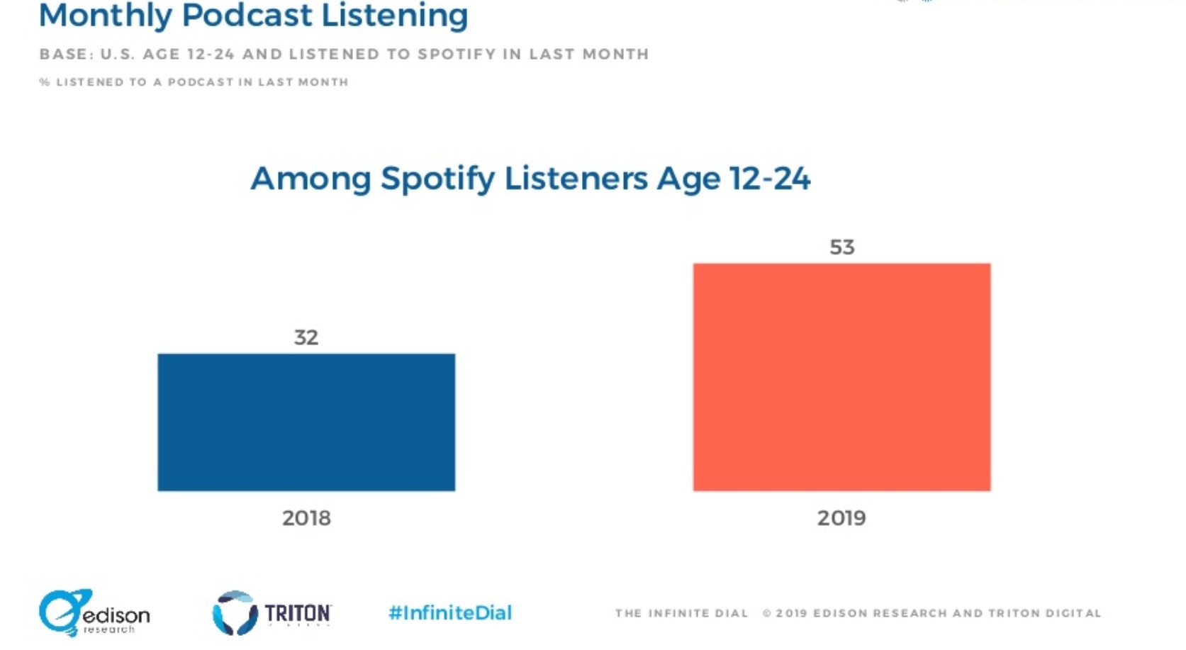 C’est d’ailleurs parmi les utilisateurs de Spotify âgés de 12 à 24 ans qu’on observe le bond le plus important d’écoutes de podcasts. En 2018, 32% avait déclaré en avoir écouté un le mois précédent. Ils sont 53% en 2019.
