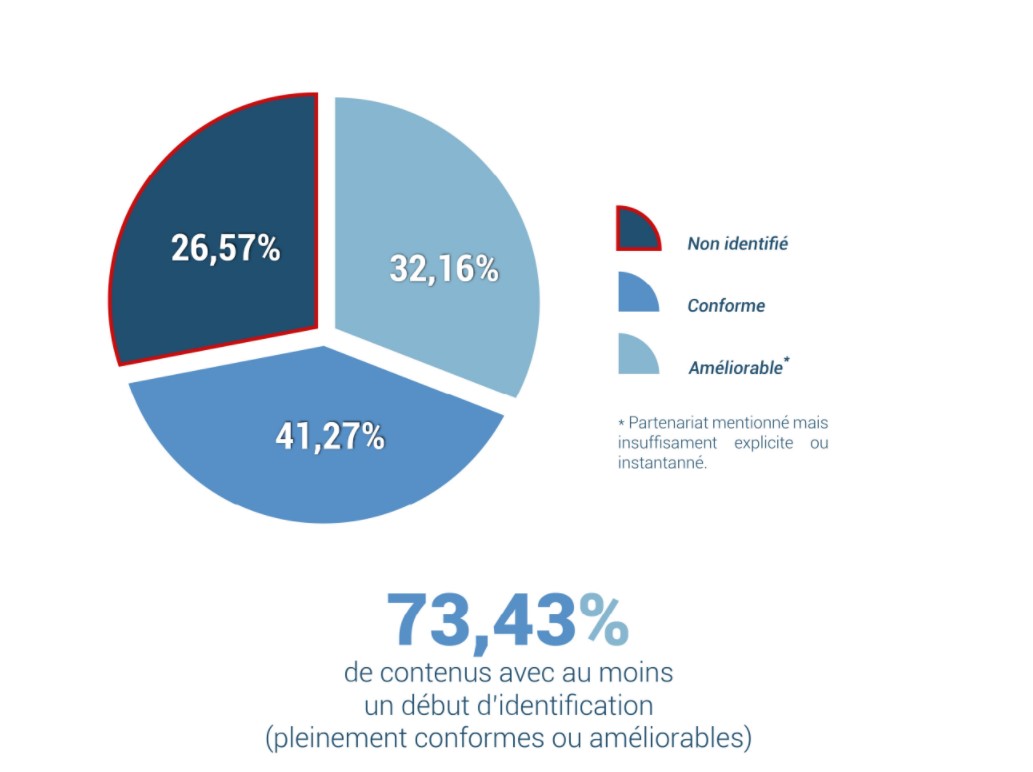 Les résultats obtenus par cette enquête mettent en évidence un manque criant de transparence de la part de certains influenceurs. Ainsi, si 73,4 % des publications montrent un début d’identification de sponsorisation, 32,2 % de ces contenus sont améliorables, car le partenariat est mentionné mais pas de manière assez explicite. Plus alarmant, 26,57 % des contenus analysés n’affichent pas du tout qu’il s’agit d’une collaboration rémunérée.
