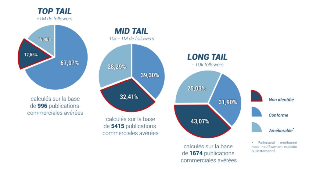 Le régulateur a également analysé les manquements aux règles publicitaires de l’influence sous le prisme des différentes catégories d’influenceurs (à plus ou moins grande audience). Ce sont ainsi les influenceurs de moins de 10 000 abonnés qui montrent le moins de transparence, avec un taux de manquement s’élevant à 43 %. En revanche, plus l’influenceur a une forte audience et se professionnalise, plus il applique les règles de transparence concernant ses collaborations commerciales. Dans la catégorie des influenceurs de plus d’1 million d’abonnés, seulement 12,5 % n’identifient par leurs partenariats contre 68 % qui l’affichent.