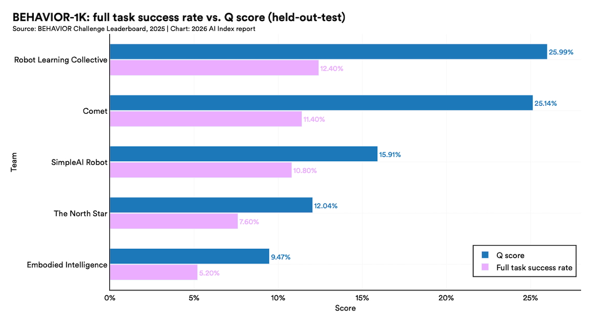 L’asymétrie se retrouve sur d’autres terrains. Côté robotique, les meilleurs systèmes atteignent 89,4 % de réussite sur RLBench en simulation, mais l’équipe gagnante du BEHAVIOR Challenge 2025 (Robot Learning Collective), qui évalue 1 000 tâches ménagères réalistes, ne complète intégralement que 12,4 % des tâches. Pour les sciences, plusieurs modèles dépassent en moyenne les chimistes humains sur ChemBench, mais tombent à moins de 20 % sur la réplication d’astrophysique et à 33 % sur les questions d’observation de la Terre.