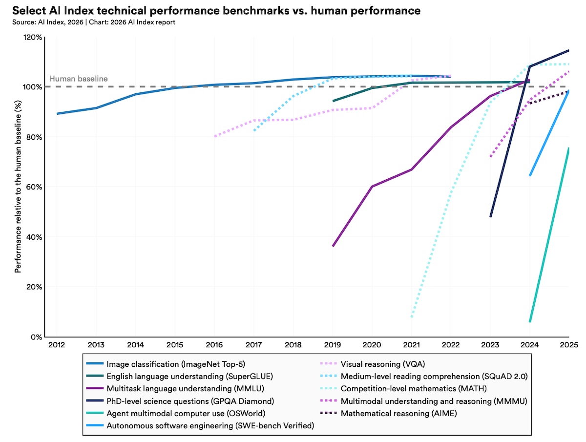 Sur les benchmarks conçus pour défier l’intelligence humaine, les modèles d’IA enchaînent les records, jusqu’aux médailles d’or aux Olympiades internationales de mathématiques. Mais sur des actions du quotidien, ils peuvent encore se tromper de plusieurs heures sur l’heure qu’il est ou rater 9 tâches ménagères sur 10. Le rapport AI Index 2026 de Stanford documente ce paradoxe et le nomme : la « jagged intelligence ».