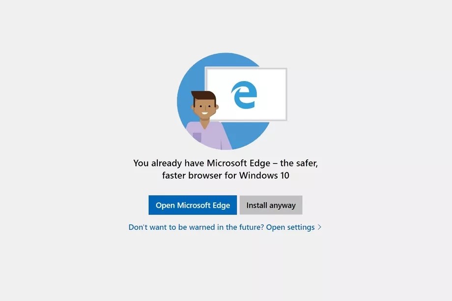 Nous ne sommes pas le 1er avril. Microsoft essaye réellement de vous dissuader d’installer un autre navigateur. « Vous disposez déjà de Microsoft Edge – le navigateur le plus sûr et le plus rapide pour Windows 10 ». Vous avez ensuite le choix entre « Ouvrir Microsoft Edge » (en cliquant sur un beau bouton bleu sur fond gris) et « Installer quand même » (en cliquant sur un bouton gris sur fond gris).