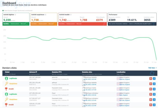 Pour les grands comptes, un plan Ultimate vous permet de bloquer tous les types de trafic incorrect (et pas uniquement le trafic frauduleux), d’avoir accès à un gestionnaire de comptes dédié, de personnaliser le tableau de bord et générer des rapports en marque blanche (idéal pour les agences).