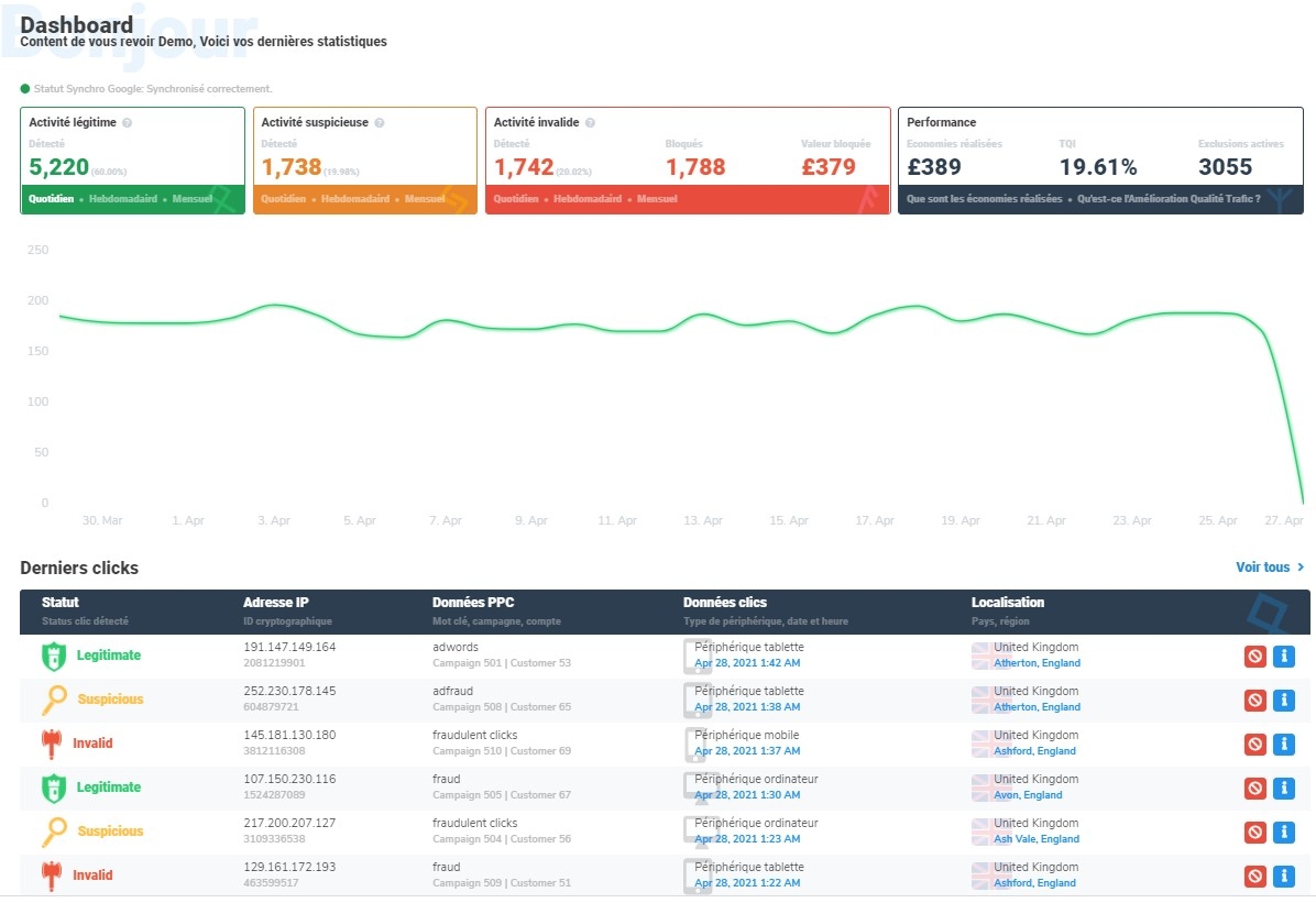 L’outil est capable de détecter toutes les menaces sur vos campagnes : bots, scrapers, concurrents… Une fois implémentée, la solution vous permet de réduire vos CPC en bloquant le trafic de mauvaise qualité.