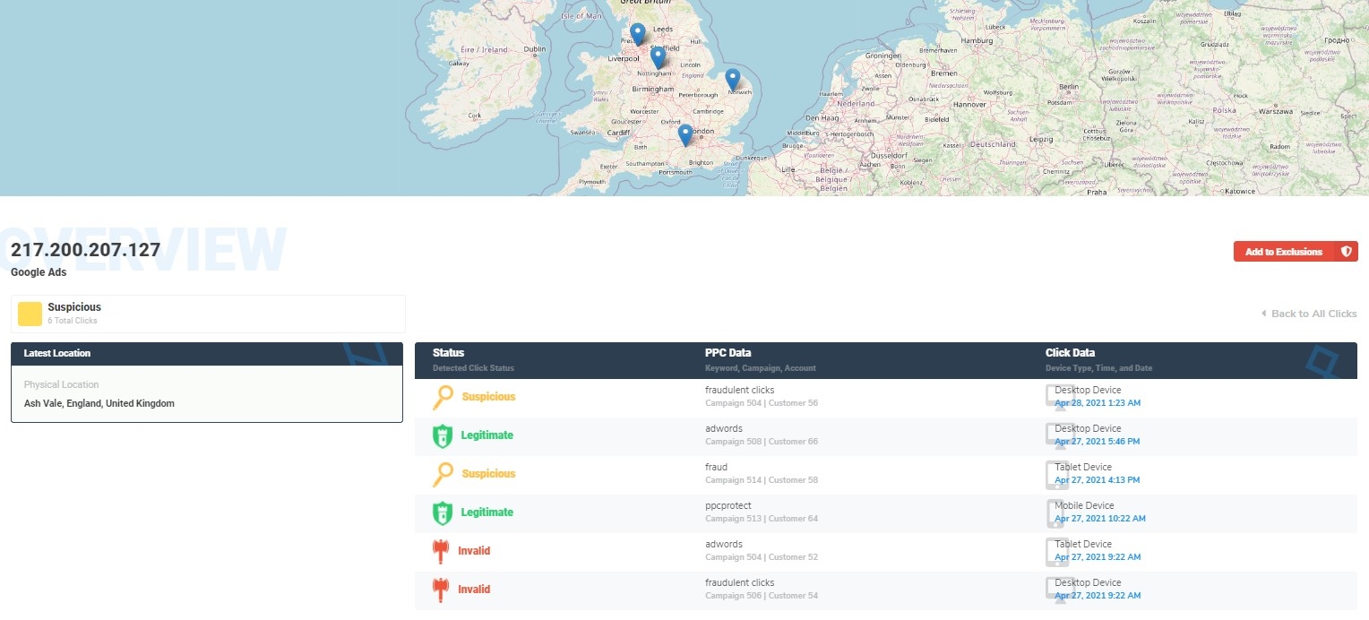 Dès que vos campagnes sont suivies sur PPC Protect, chaque clic provenant de chacune de vos campagnes Google, est analysé en temps réel : IP, localisation, appareil, user agent… Le clic est ensuite comparé aux bases de données de trafic incorrect, et aux domaines déjà blacklistés par PPC Protect. Grâce à l’IA propriétaire et aux analyses en temps réel, PPC Protect détecte aussi les clics incorrects de domaines ou appareils qui n’étaient pas préalablement identifiés.