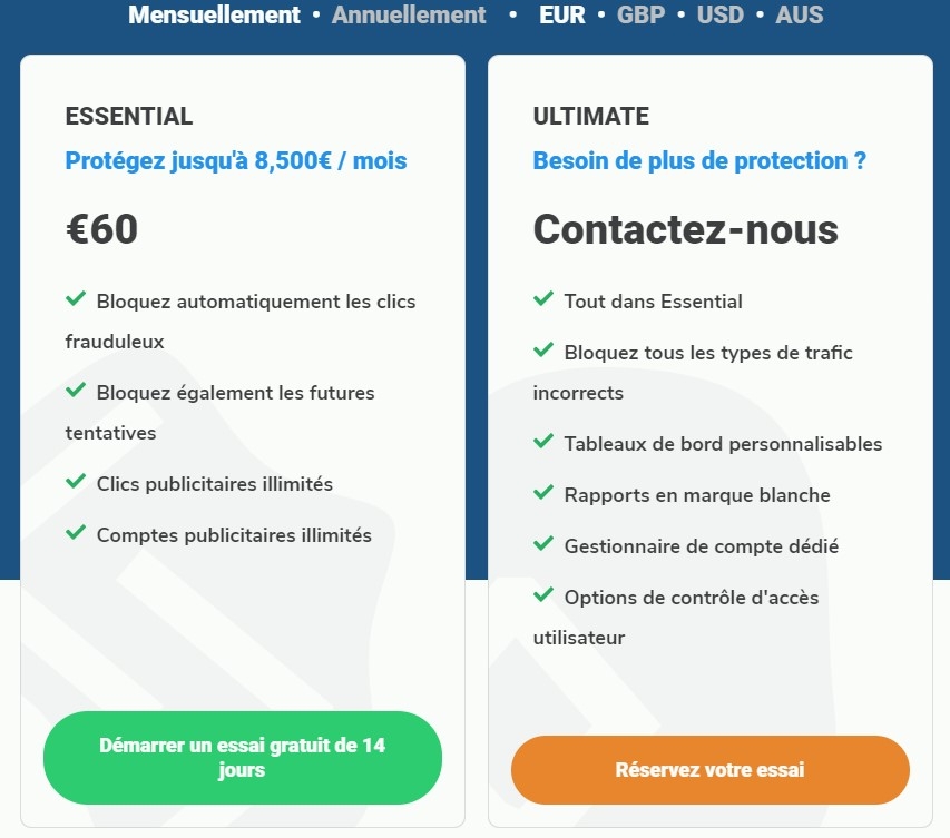 Le plan Essential est destiné à des budgets média allant jusqu’à 8500€ mensuel et coûte 60€ par mois. Il inclut un nombre illimité de clics sur vos publicités et un nombre illimité de comptes publicitaires à protéger.