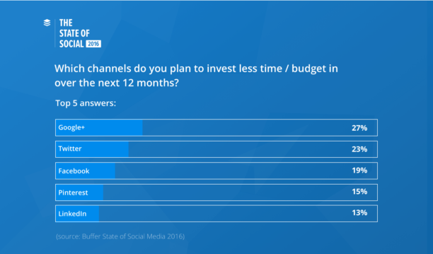 En revanche, pour Google+, la partie semble bel et bien terminée. 27% des community managers vont investir moins de budgets ou moins de temps sur Google+ en 2017. Twitter est également cité par 23% des répondants.