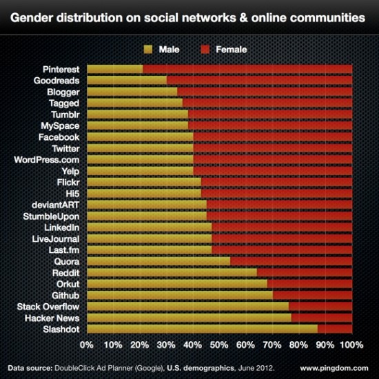 On le savait déjà, les femmes dominent les réseaux sociaux. Elles sont une grande majorité sur Pinterest, Blogger, MySpace ou encore TumblR. Les hommes se contentent de Github, Reddit ou Orkut.