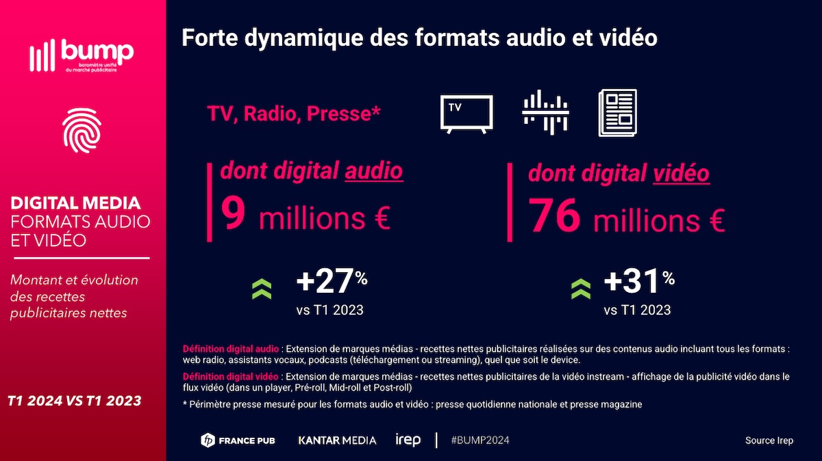 Comme lors du dernier baromètre, les recettes publicitaires digitales de la télévision, de la presse et de la radio « affichent une dynamique très soutenue », enregistrant une hausse de 20,8 % par rapport au T1 2023. D’après le BUMP, cette progression importante s’explique par « l’accélération continue du format audio » , dont les recettes ont augmenté de 27 %, ainsi que par la « progression forte du format vidéo », également en hausse de 31 % par rapport à 2023. Au total, l’audio (web radio, podcasts, assistants vocaux) et la vidéo (player, pré-roll, mid-roll et post-roll) ont, respectivement, généré 9 millions d’euros et 76 millions d’euros de recettes publicitaires sur la période.