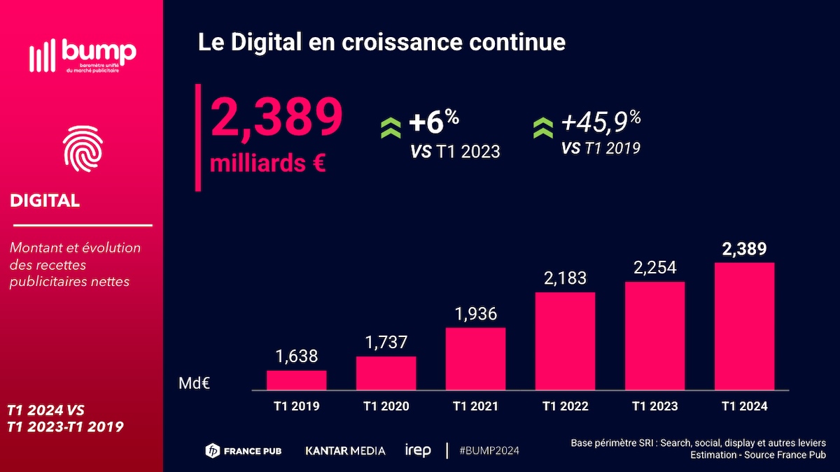 France Pub, Kantar Media et l’Institut de Recherches et d’Études Publicitaires (IREP) ont publié, ce jeudi 16 mai 2024, la dernière édition du Baromètre Unifié du Marché Publicitaire, dit BUMP. Compilant les « données de pression publicitaire brute de Kantar Media avec les dépenses en net des annonceurs déclarées à France Pub et des recettes publicitaires recueillies par l’IREP », le BUMP vise à prendre la température du marché publicitaire en France. Et bonne nouvelle : au premier trimestre 2024, celui-ci « reprend des couleurs », explique le rapport, puisque les recettes publicitaires ont augmenté de 3,8 % par rapport à l’an dernier. Mais le secteur de la publicité digitale connaît-il une progression aussi marquée ?
