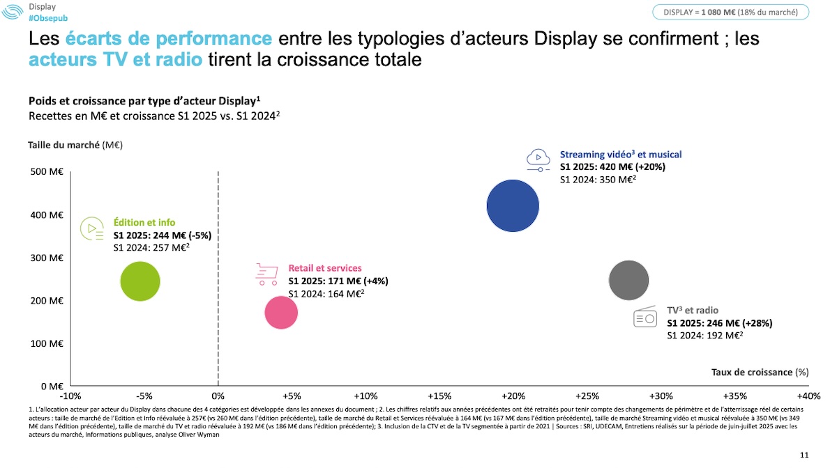 - Display : 18 % de part de marché (1,08 milliard d’euros),