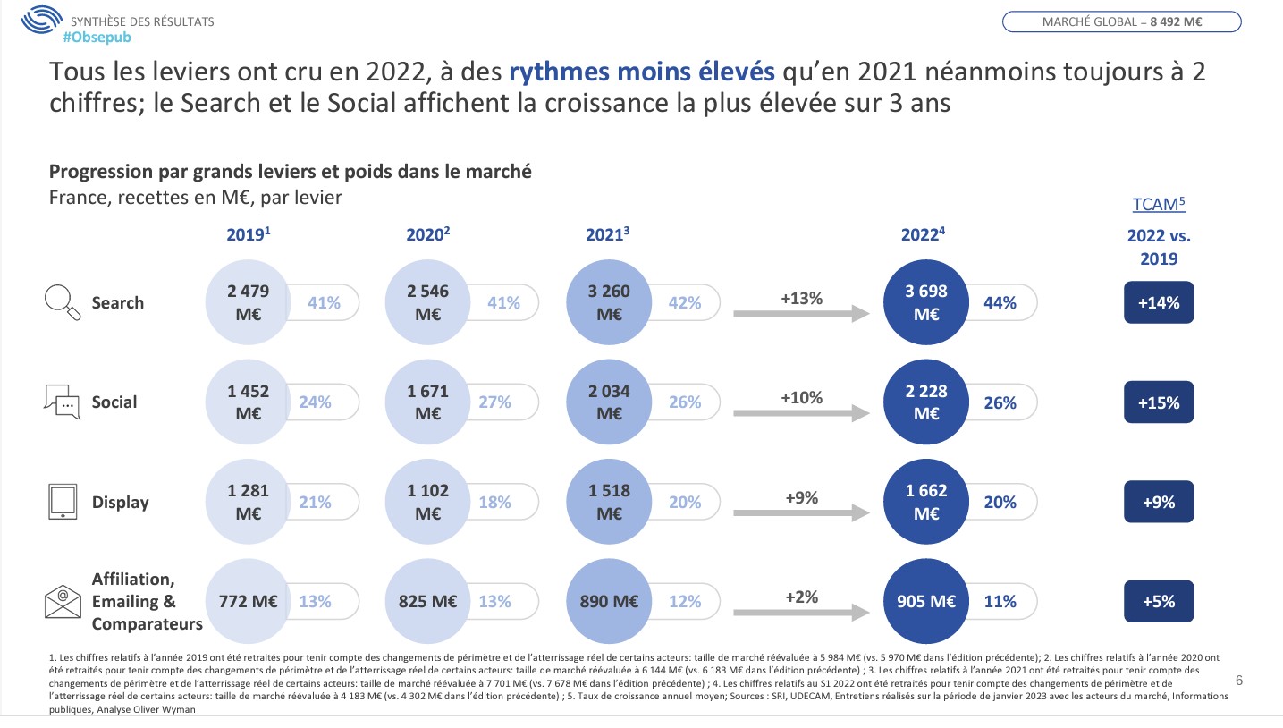 - Le levier qui a la plus forte croissance : le Search reste le levier majeur du marché avec une croissance à +13 % (notamment grâce à l’impulsion du Retail Search).