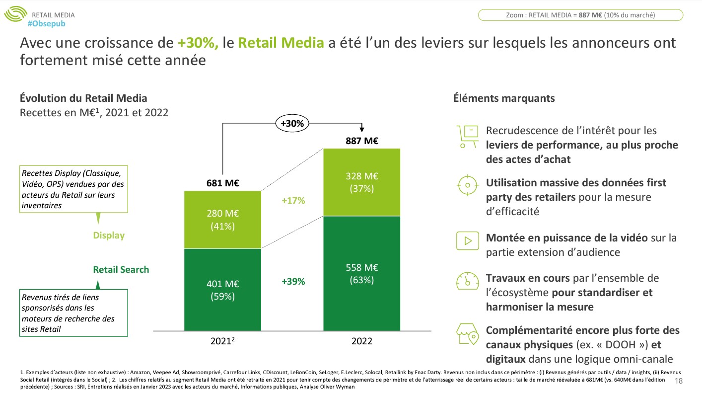 Avec une croissance de +30% (887 millions d’euros), le Retail Media est l’un des leviers sur lesquels les annonceurs se sont focalisés sur l’année 2022. La répartition des revenus est la suivante : le Retail Search (558 millions d’euros) et le Retail Display (328 millions d’euros).
