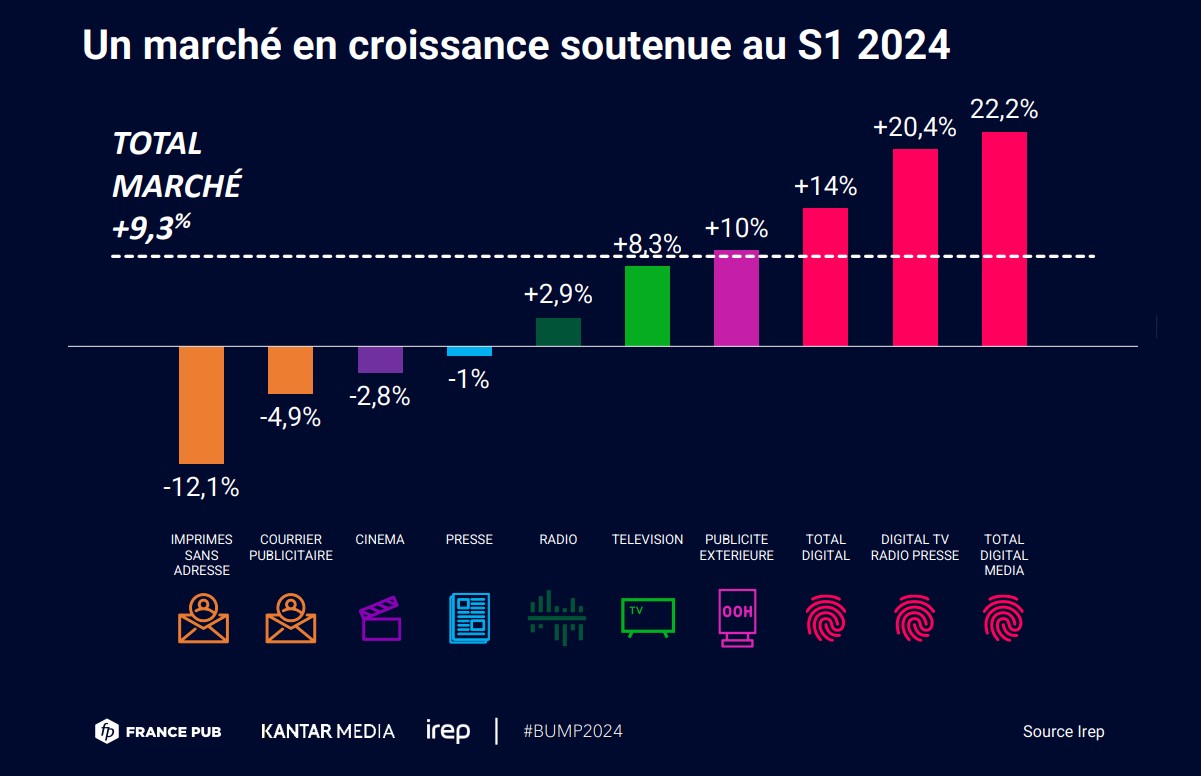 France Pub, l’IREP et Kantar Media publient le Baromètre Unifié du Marché Publicitaire (BUMP) pour le premier semestre 2024. Ce rapport, qui compile les données des trois instituts, offre un aperçu complet des tendances publicitaires en France. Au cours des six derniers mois, les recettes publicitaires de l’ensemble des médias ont atteint 8,4 milliards d’euros, marquant une augmentation de 9,3 % par rapport au premier semestre de 2023. Le BUMP associe cette croissance à l’impact des événements sportifs estivaux, mais également à l’essor de la publicité digitale. On fait le point !