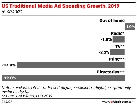 L’année 2019 sera un tournant pour le monde de la publicité aux États-Unis. Pour la 1ère fois, la publicité digitale représentera plus de 50% de parts de marché. Autrement dit : elle dépassera le marché de la publicité à la télé et à la radio.