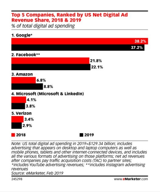 C’est Amazon qui va sortir son épingle du jeu en 2019 : « Amazon est très avantageux pour les annonceurs et particulièrement les vendeurs de produits de grandes consommations et les acteurs en D2C (Direct-to-consumer)« , explique Monica Peart, directrice des prévisions chez eMarketer. « La plateforme est enrichie de données comportementales des acheteurs et donnent la possibilité d’accéder à des données en temps réel. (…) Avec la plateforme de publicités sponsorisées d’Amazon, les marketeurs ont un accès sans précédent à « l’étagère » même où le consommateur a acheté un bien. »
