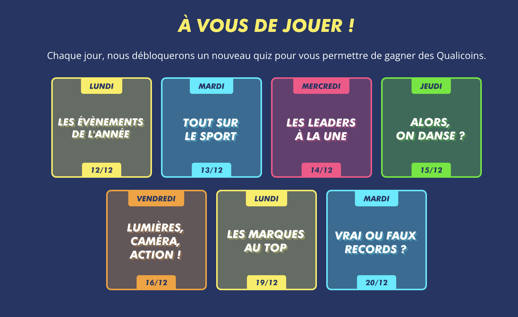 Qualifio ne se contente pas d’un simple quiz de fin d’année. Chaque jour, un nouveau quiz est débloqué et vous gagnez des « Qualicoins » si vous répondez avec succès aux différentes questions posées. Qualifio utilise pour cela son module de fidélisation Qualifio Loyalty et vous récompense selon les actions réalisées :