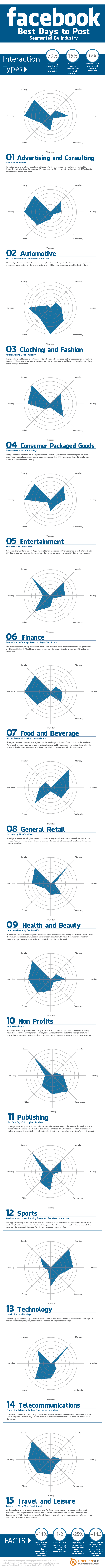 Pour affiner l’analyse, il peut être utile de ne prendre en compte que les données des entreprises de son secteur d’activité. C’est un bon début, même si des différences individuelles peuvent persister entre les marques. L’agence Linchpin s’est donc basée sur les données de ses clients pour tenter de mettre en évidence les meilleurs jours pour partager du contenu sur Facebook, suivant le secteur d’activité :