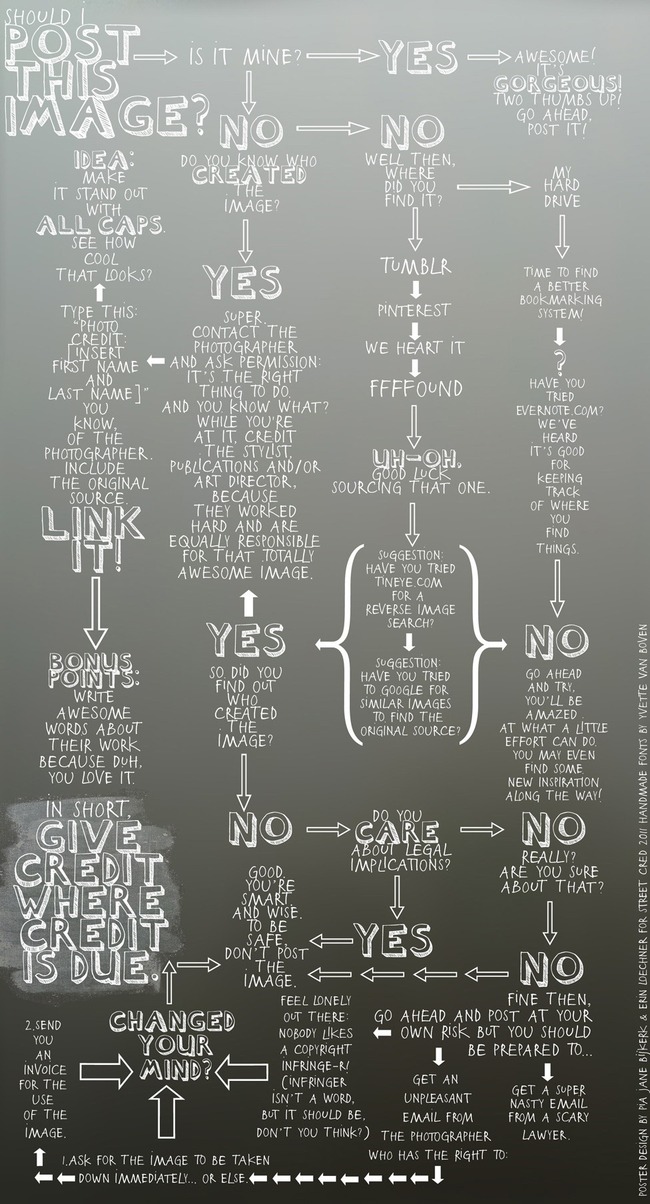 Cette anecdote ramène à une réalité courante sur le web, celle du vol de contenu et du non-respect des droits d’auteur. C’est le cas pour beaucoup de blogueurs qui voient leurs billets repris entièrement ou en partie sur d’autres supports sans autorisation. C’est également le cas de bon nombre de photographes ou de graphistes qui se font reprendre leurs images ou photos sans même un crédit. Une bonne fois pour toutes, ce n’est ni éthique ni légal ! Avoir trouvé une image sur Google images ou sur un autre blog ne la fait pas pour autant tomber dans le domaine public. La référence à son auteur reste un minimum et ne suffit parfois même pas. Les licences Creative commons peuvent permettre d’identifier les conditions d’exploitation. Dans d’autres cas, vous devrez chercher à contacter l’auteur pour lui demander l’autorisation. Et oui, la facilité d’une action ne la rend pas légitime pour autant… Si vous ne jouez pas le jeu, il ne faudra pas se plaindre des conséquences éventuelles. Pia Bijkerk, Erin Loechner et Yvette van Boven ont réalisé un diagramme décisionnel qui récapitule les bases en la matière. Alors, pouvez-vous utiliser cette image dans votre billet ?